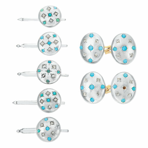 For the dapper gentleman in your life, this platinum, gold, cabochon turquoise and diamond dress set would be the ultimate accessory.