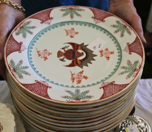 In Little Compton, the three of us were lucky enough to time our visit with a local church fair. One of the most appealing aspects of this charming town is its time warp quality, which I love. Other than the addition of modern cars and ATMs, much of the town looks like it hasn’t changed in decades. I’m sure this event must have been about the same 40 years ago. As Dominique alluded to in her post, I scored big time! I love tabletop and found this incredible set of vintage plates. They have a fabulous heraldic quality and with their beautiful muted colorway, will be perfect to mix and match with many of my other pieces. Now for the best part – a set of twelve for $30! Yes, you read right! The prices seemed out of the past as well!!