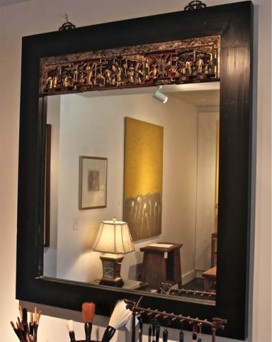 Gallery 4 is an eclectic space, with both art and antiques. I gravitated to the same collection as Dominique. This beautiful Chinese mirror would be at home in a variety of spaces, from traditional to modern. The detailed frieze at the top set within the simple wooden border creates an elegant contrast.