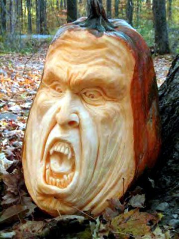 They give me the creeps, but I guess that’s the idea. I am always mystified by artists that put so much into something so ephemeral whether it’s an ice or sand sculpture, a sidewalk chalk picture, or these pumpkins. As for carving a pumpkin, Ray Villafane’s efforts are enough to make this amateur pumpkin carver give up altogether.