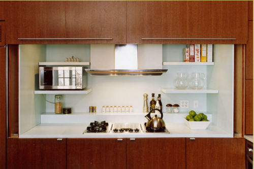 Two apartments were combined and completely renovated. The inspiration was the early modern interiors of Pierre Chareau and Adolph Loos. The last 3 shots show the center room which functions as dining room/kitchen. It is lined with secupria millwork panels. When closed, the room can be used for formal entertaining. When open, the appliances and storage are exposed. Isn’t it amazing?!