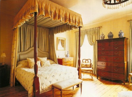 I love this classic bedroom with bedcovers and hangings by Chelsea Textiles (of course).