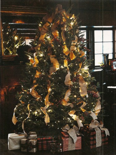 A simple classic tree with burlap ribbon and white lights is all you need in this setting.