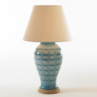 The vignette, created for Traditional Home, one of the event sponsors, was fashioned as a dream office for a female design blogger – and they so got it right. I would feel totally at home here! And I clearly wasn’t the only one – I had to ask Suysel and Anne for an official shot because it was so crowded (and already picked over) when I got there. The walls were covered with a beautiful Brunschwig documentary fabric, Seychelles, which they had paperbacked. It is just the right combination of tailored and feminine, and really anchored the space. The lovely salmon and blue accents were then brought out with the furnishings and accessories, such as Bunny Williams’ Beeline Home’s turquoise lamp at left in the shot and below.