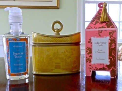 Lastly, I was visiting Tina over at The Enchanted Home checking out her daily inspiration and was thrilled to learn I had won this delightful trio of Seda treats. I adore Seda – both their packaging and products are so lovely. The item in the middle is known as Jardins du Seda and is a beautiful ceramic toile container with a 2 wick candle – the scent of this one is Asian Pear and is wonderfully exotic!