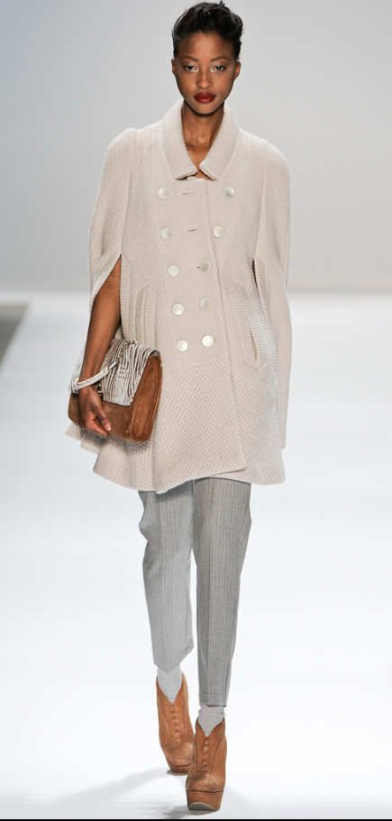 Oh can I be you Quintessence! I promise I would sit nicely and be a behaved fashionista. I have never enjoyed looking at fashion so much! See what your blog is doing to me? O.K., I was absolutely taken with the poncho. I love my capes and ponchos I brought back from Florence. I also really coveted that grey jacket with the ruffles. Other than the overall appeal of this line, the next item that caught my eye was the jewel toned dress, and Oh! yes! the square purse with the rounded handle. Thank you for my daily fashion update. Going to the gym now!