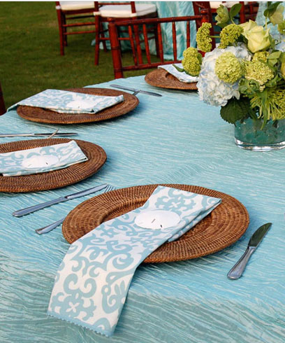 This wedding reception by Celestine’s in Santa Rosa Beach, FL cleverly used the Tapestry Ocean Guest Towel as large dinner napkins. It’s a beachy versatile pattern that I own myself.