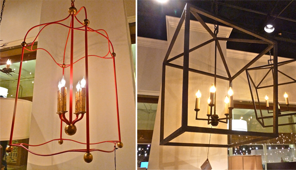 The whimsical Carousel Lantern in lollipop red and gold and architectonic Denison Lantern in mole black are terrific for when you would like a large fixture with little heft.