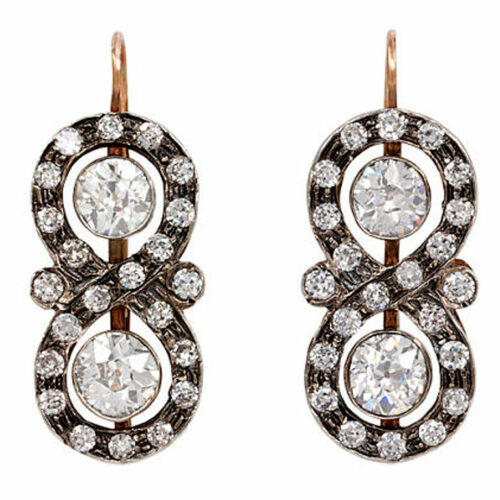 Such a dramatic necklace calls for earrings that won’t detract. These antique french diamond earrings circa 1890 from Kentshire will do the trick nicely. The combination of diamonds, oxidation and rose gold match the tonalities of both necklace and dress.