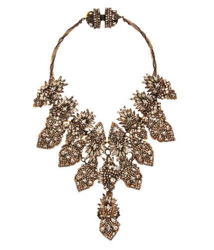 While I do love the Oscar necklace paired with the dress, I think I would switch it out for this tonal yet dramatic Erickson Beamon Bette David Eyes Crystal Bib Necklace. Its neutral coloration echoes the beautiful chiffon underlay of the dress while adding a little edgy bling.