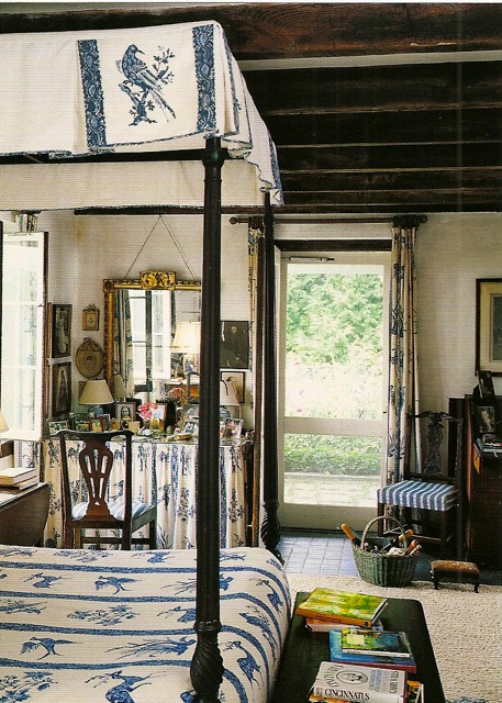 The master bedroom is oozing with timeless charm. Would you prefer a house like this or one which embraces more modern trends – a topic Rebecca over at Acanthus and Acorn just addressed. Of course it doesn’t have to be so black and white, but this is the gist of the discussion. Love of blue has been expressed frequently but most recently by The Buzz, Pretty Pink Tulips and Sanity Fair among others. My bedrooms, like this one, have almost always been blue. I find it such a restful color that “plays well with others”. I also have delft tiles on my fireplace and a four poster.