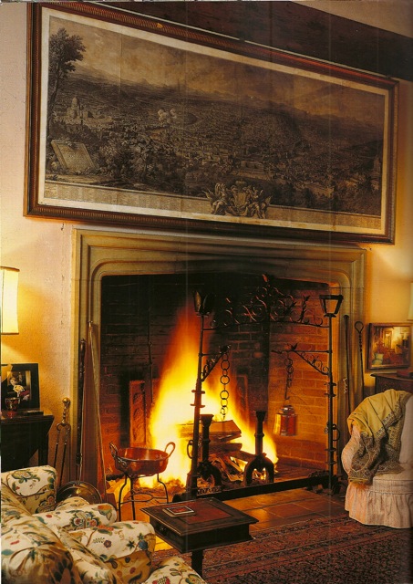 The great room, with its large limestone mantel is topped with a nine foot long engraving Rome in 1765 – which I was reminded of when someone was discussing decorating for a client with an interest in ancient Rome – please excuse the fact that I can’t remember who that was!! And the hearth reminded me of something out of Wuthering Heights, a recent At the Movie pick.