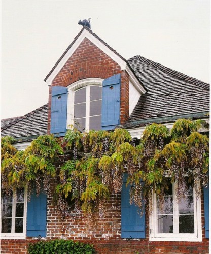 The beautiful wysteria and painted blue shutters embue the house with its rural bucolic essence. And don’t miss the glazed ceramic cat perched atop the dormer peak.