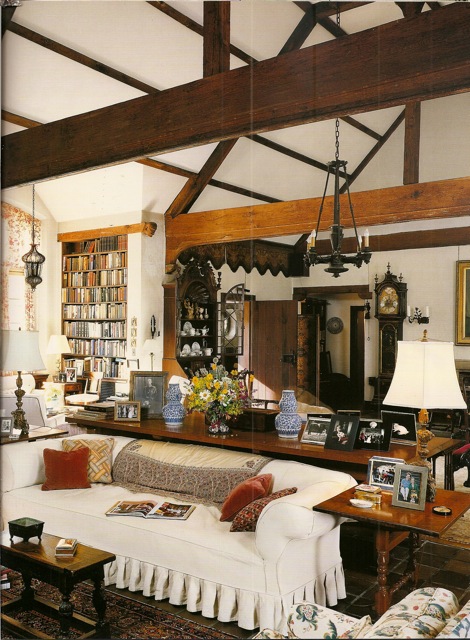 There is always talk of books and bookcases in our corner of the blogosphere and I love the one here nestled in the wall as well as the beams salvaged from the renovation of South Station in Boston. Also, someone was recently talking about white slipcovered furniture – don’t you love the flounced skirt here? And I adore the unusual arm on the sofa as well.