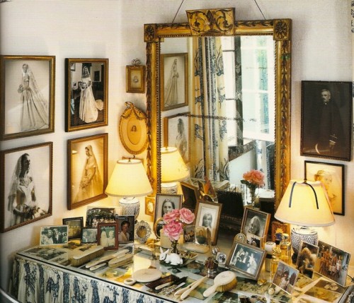I adore this shot! It speaks volumes about the owner of the house. How charming are the four portraits of family brides on the left – all wearing the same wedding dress! My desk growing up also had a glass top where I would tuck my favorite photos underneath. And the ivory dressing table collection reminds me of both the Thinking Outside of the Box exhibit at the Met that I covered as well as the post about collections that the girls over at Design Chic ran the other day.