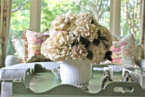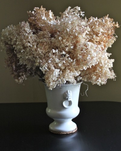 Sometimes we let them dry and use them that way all winter, although the even better solution is to have them preserved. They then become the superior version of silk flowers, real but maintenance-free. My sister-in-law has several stunning arrangements of preserved hydrangea executed by Barbra Scott in NYC , who has done work for Bunny Williams and Jamie Drake as well as quite a few corporate clients including Conde Nast.