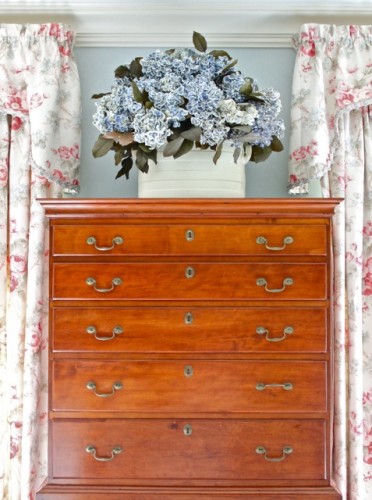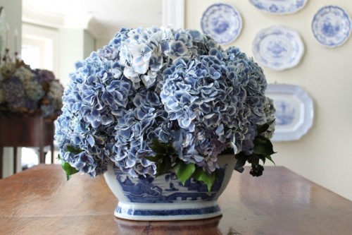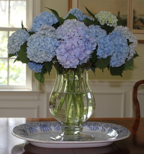 I love hydrangea – is there anyone who doesn’t? They are the perfect summer bloom. As the end of summer is approaching, I am so sorry I won’t have my masses of blue outside my window to look at for much longer. I am lucky to have quite a few hydrangea bushes that supply my house with multiple bouquets all summer long. Shirley, my right hand “man”, who keeps me and our home running smoothly in every way, is also a gifted florist, who created these lovely arrangements.