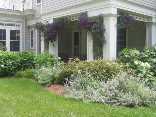 From the other side – little squares continuing around the corner. My husband gets total credit for the beautiful blooms – he trained and nurtured them.