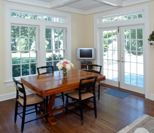Here you can also see the clips holding the storm windows. My husband’s and my major objective with our renovation was for it to look as seamless as possible. We both adore architecture from the 1920’s and 1930’s and wanted to evoke that era, creating an addition sensitive to scale and detail. Our area is overrun with mcmansions and we wanted to avoid that look at all costs. When choosing windows, we ultimately decided to have them custom made for that authentic period feel. They are accurate historic reproductions with weight and pulley counterbalances and visible brass chains on the inside. The storms and screens are wood as well and even though they have to be exchanged twice a year, they look beautiful and are very effective. Here is from inside the kitchen where you can see the squares on both doors and windows (please ignore the then temporary placement of TV and makeshift stand)