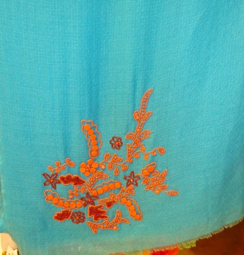 At first I was going to pass them by, but as I approached, I realized they were something special. These were not your average pashminas but lovely luxurious pieces embellished with lace, embroidery, tasteful crystals and other stylish additions.
