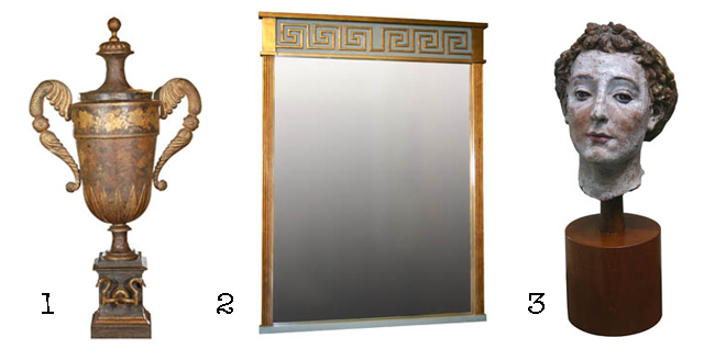 1) French 18th Century Painted Tole Lavabo 2) Hollyhock’s Greek Key Mirror