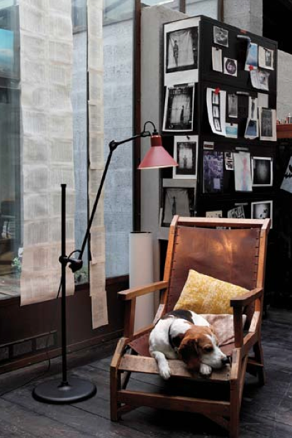 I agree, they have never gone out of style. Great design never really does. The image with book pages in the window, the cool chair, the interesting looking black and white prints behind AND a cute dog – LOVE it :)