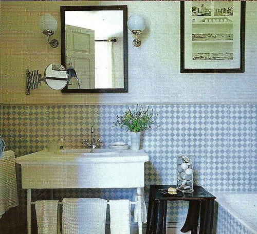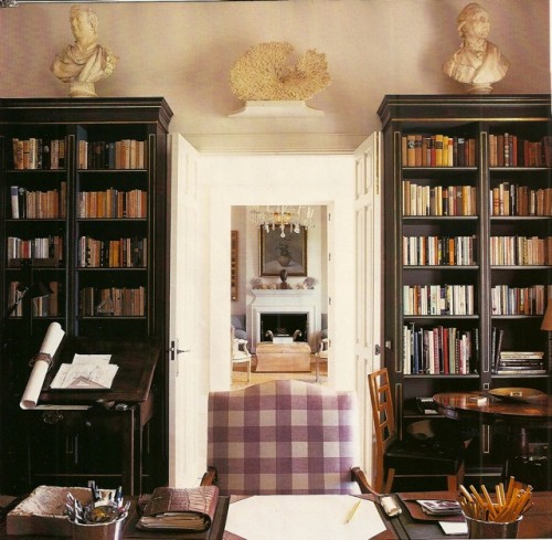 The airy color scheme is in direct contrast to the darker more masculine design of the library. I adore everything about this room with all its fabulous tailored details – the gold inline on the dark bookcases, the busts, the amazing gigantic print. And that Claremont check is a fantastic graphic pop of color against the otherwise neutral coloration. You wouldn’t be surprised to see this room in a magazine now – great design stands the test of time!