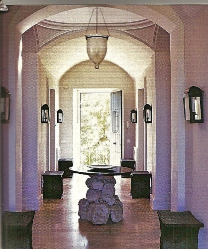 We are ever so slowly getting infinitesimal hints of spring. Even though there are still feet of snow on the ground, the days are getting minutes longer and the light just a hair brighter. With these encouraging hints, I was inspired to show you a house I’ve always admired in the lovely city of Marbella on the Costa del Sol. This house, in the hills above the city within a cork plantation, has spectacular views overlooking Gibraltar, Africa and the Ronda Hills. Built from scratch, it was designed by Hugh Henry of the well known and respected British firm Mlinaric, Henry and Zervudachi. Because the cork trees were protected, the house had to be sited around them, creating an intimate relationship between inside and out. The house is shaped like a cross with terraces surrounding on all sides and as you will see, the decor echoes the symmetry of the architecture. Here is the center hall running through the middle of the house, lit by a cupola