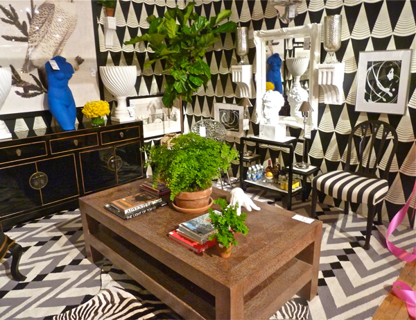 It was impossible not to be wowed by Miles Redd‘s amazing room. Starting with an incredible layering of black and white pattern and graphics, he added single punches of bright primary color – exactly like what we saw in so many of the fall 2012 runway shows. And it is a perfect lesson in how commercially available items such as Restoration Hardware’s Royal Master Sealight floor lamp and reproduction 19th C. Baroque Ravenna Etched Mirror can be successfully woven into a more sophisticated space. Lucky Amanda Nisbet nabbed the fabulous urns and author Susannah Salk will be finding a place to hang the fantastic Owl print!