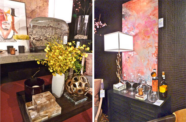 Fabulous art The Chinese Scholar’s Rock from Pagoda Red, above left, was an amazing addition to the space, bringing “epic proportion, instant history and color perfection.” A lot to offer from a single stone!! And while Hamilton’s vignette featured a bounty of beautiful art, I think my favorite was Margaret Pettee Olsen‘s custom commission above right. A RISD compatriot of Hamilton’s, her work is sensuous and sophisticated, the perfect foil for the masculine tone of the room.