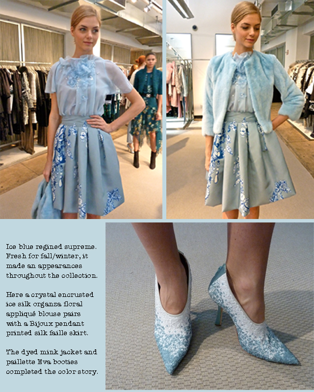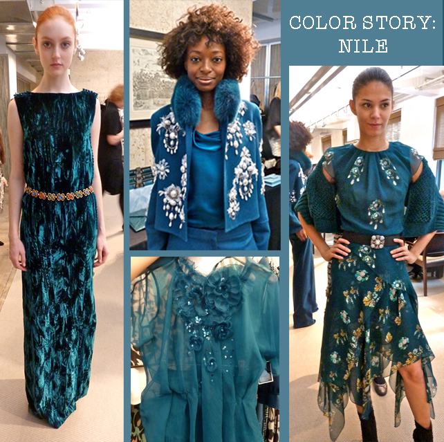 Ice was countered with a baby pink, named rosé in similar Bijoux printed silks, 50s inspired jewel encrusted princess dresses and dyed mink. But my favorite color story in the collection was nile, a rich blue/green redolent of both fall and its festivities. In crushed velvet, cashgora or silk, it make a smashing statement in both fashion forward and traditional designs.