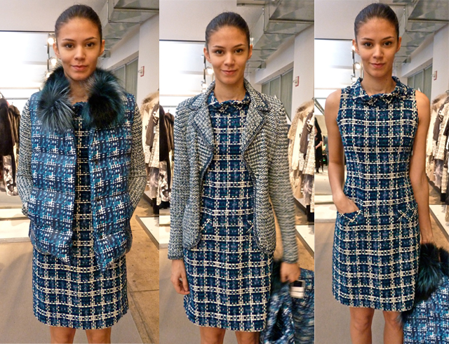 Within the nile story, you can see the rich layering that makes an Oscar collection so very special. The classic nile ribbon tweed dress is layered with a coordinating but not matching tweed jacket and topped with the casually chic abstract tweed printed nylon down vest with nile fox collar. So many ways to make the look work for you!