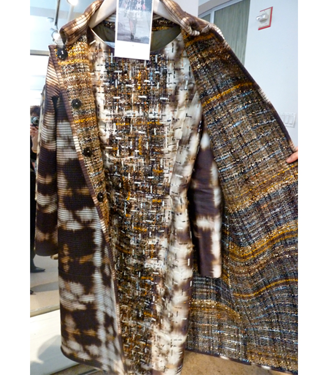 This homage could easily become a tome – there were that many beautiful pieces. But in conclusion, I thought I would show you, if I had to choose (big if), what I would pick from the runway. As soon as I saw this outfit, I knew it had to be the one, partly because of the beautiful sable tonality, perfect for someone of my coloration. Although hard to see, there is paillette embroidery on the tweed printed silk dress. And the crepe de chine coat is going to be reversible from the quilted print to the inside tweed. Exquisite in every way!! Stop by tomorrow when we will have a look at the accessories, shoes and fabulous furs in this marvelous collection!!