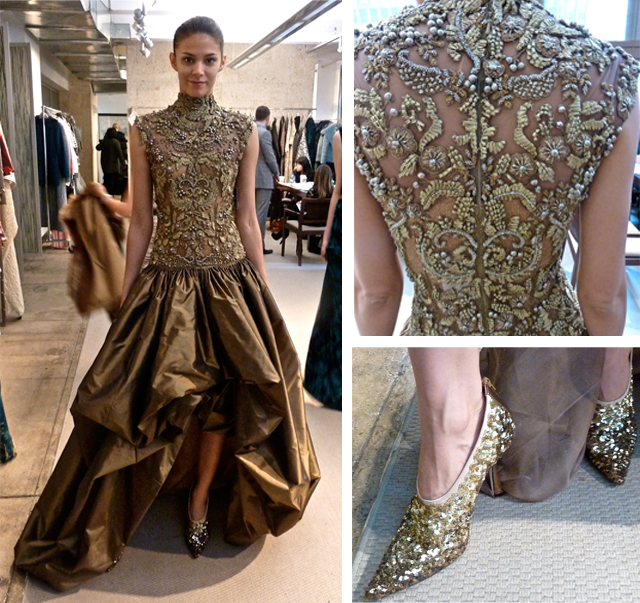 to fully ornamented gilt, gold made a strong appearance. This gold bullion and bead embroidered glitter tulle gown with iridescent gold silk taffeta skirt, worn with gold paillette Eva booties, was breathtaking.