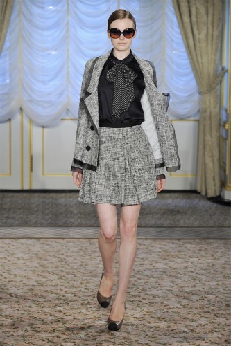 In addition to his usual signature dresses, he added tweed short suits, striped bateau tops, trench coats and beautiful jabot blouses, representing an updated version of 60’s Parisian chic. On each attendee’s seat was a box of macaroons and as the pastel colors attested, Wu explained “I wanted it to feel like dessert.”