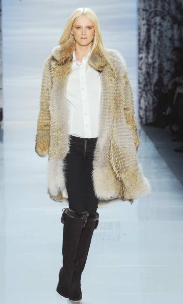 A part of Rolland’s life since childhood, the casually chic lifestyle of Aspen was captured effortlessly with her stylish looks for daytime comfort and understated elegant designs for special occasion wear. Carmen Kass opened the show with skinny jeans, white cotton blouse and coyote overcoat – perfect!
