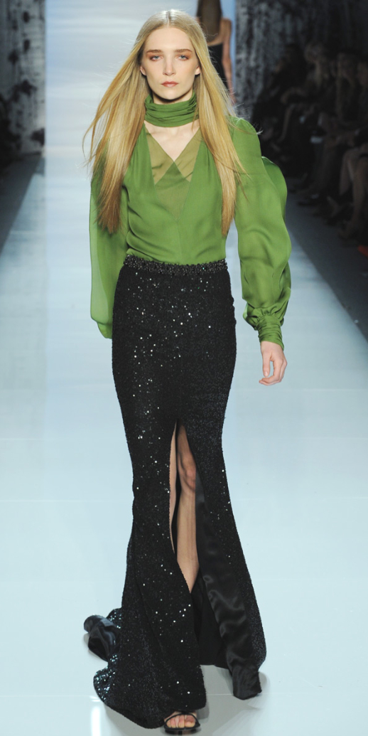 Coming up, my two favorite looks for evening from the collection. I adore this fabulous combo of green double georgette blouse with fully beaded skirt, although I might have to close the slit just a tad. Too bad I couldn’t find a shot of the back – the blouse has a beautifully draped cowl. And can you see the fabulous waistband? It’s the details…always!!