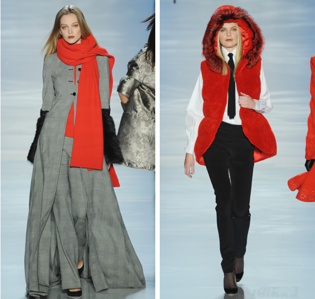 While mostly neutrals reigned, some color such as this fabulous fire red, a hot hue on the runways this season, was included. Black and white with bold splashes of color has become a theme for fall. I just love the sheared beaver quilted vest!!
