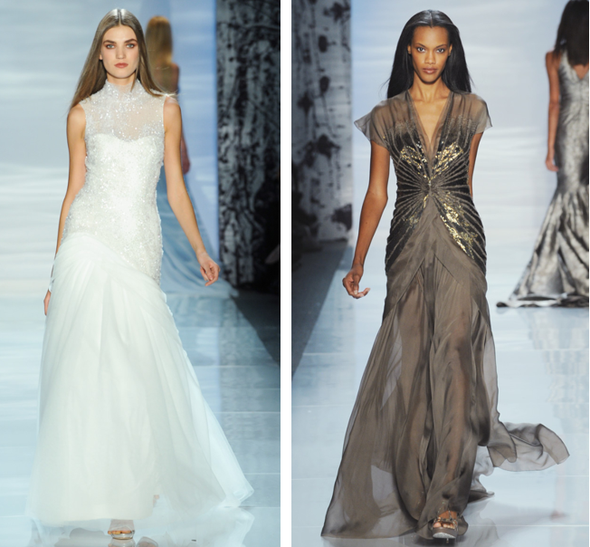 More elegantly feminine cocktail attire – understated in jacquard with beautiful embellished details, and lovely use of chiffon on the bodices as we have been seeing