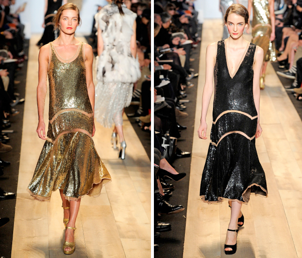 Evening is all about feminine elegance. We’ve seen sexy stylish dresses in gold in many collections. Kors’ paillette chemises, in gold or black bring red carpet glamour home with a 20s siren style.