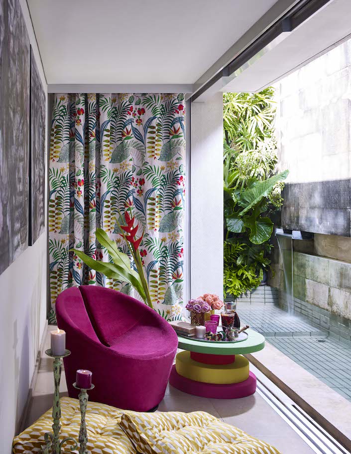 You’ll be seeing a lot of yellow this spring and Pierre Frey’s embroidered Fujin (on the curtains) and the velvet ikat Helong on the chair are great ways to brighten up a scheme with ethnic style.