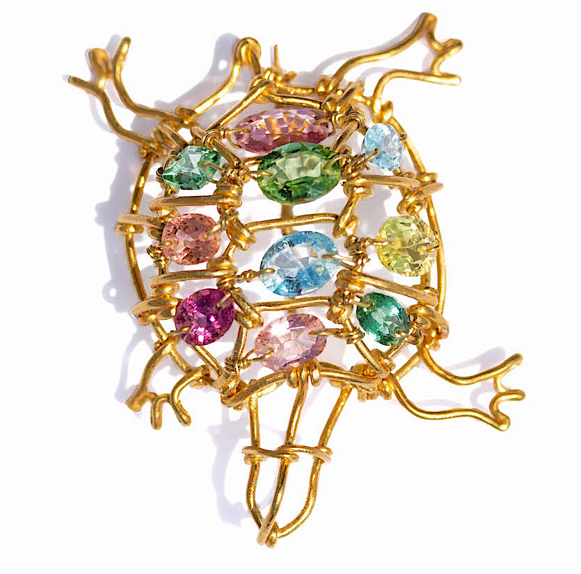 Both women have forged their way, melding traditional techniques with modern sensibilities, exuding a distinctive sense of luminosity and joy. Longtime friends, they have now collaborated on a limited series of playful, colorful and precious jewels, melding their talents into a menagerie of fanciful friends. Below, a tortoise with multicolored stones.