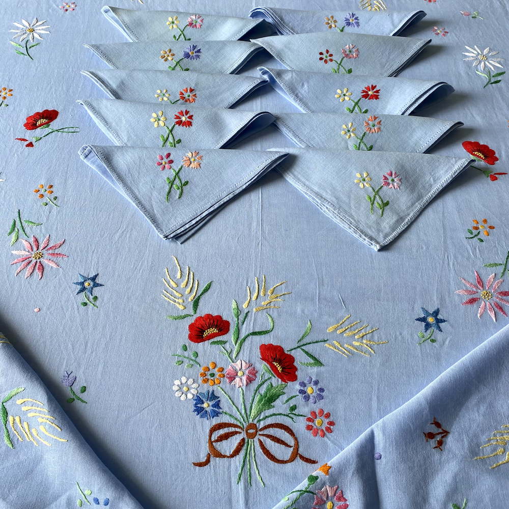 Charming vintage tablecloth and napkin set from Oficina Macmahon in a lovely soft blue cotton with white hand embroidered flowers. Made in Italy. The set is in beautiful condition, freshly laundered, clean and bright, table ready. The allure of a summer garden on your table. Would work with almost any color dinner and glassware. Just add freshly picked flowers.