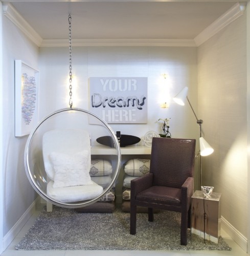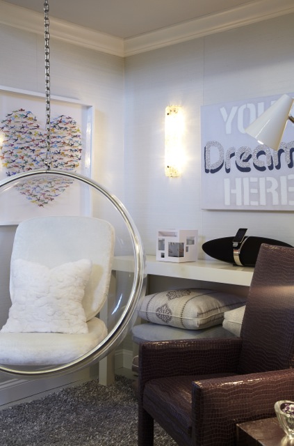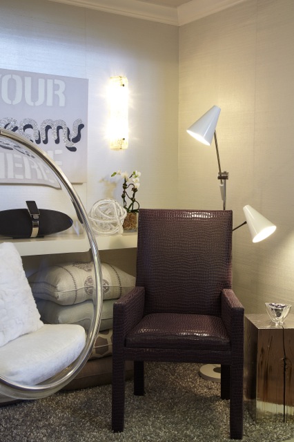 A fun upbeat mix of materials and textures, any child would be thrilled to hang out in this space. Of course the stand out was the fabulous bubble chair but I also adored the purple croc on the 1970s chair.