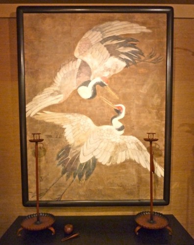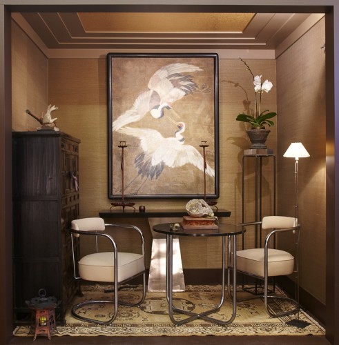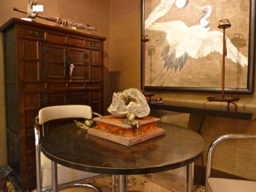 Peters worked the vignette around the spectacular piece of art which is part of his personal collection. The space included a sophisticated eclectic mix of Asian pieces mixed with American 20th century interwar period table and chairs. The fabulous architectonic ceiling also reflects this sensibility.