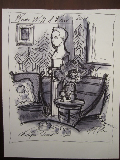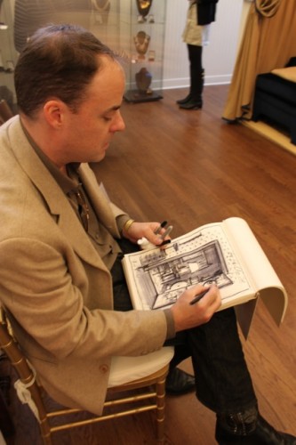 Among Peters talents is that of quick sketch artist. It was incredible to watch him work his magic with merely a Flair pen and some tissue. Peters generously sketched all of his fellow designers’ vignettes (in the back room) with great style, accuracy and ridiculous speed!! It is a talent we all agreed we wished we possessed!! Some were more stylized than others but all were frame-worthy!!
