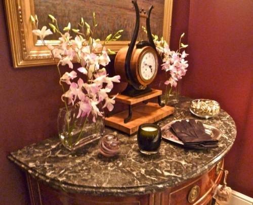 Understated yet exquisite, this tabletop vignette speaks volumes. The marble topped demi lune is a circa 1790 Louis XVI Console Table graced with a circa 1835 Austrian Biedermeier Mantel Clock. Flowers, candles, a chocolate treat and a place for a gentleman’s gloves – timeless, classic – so very civilized!