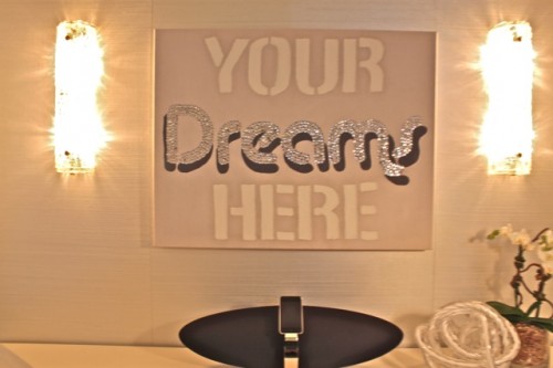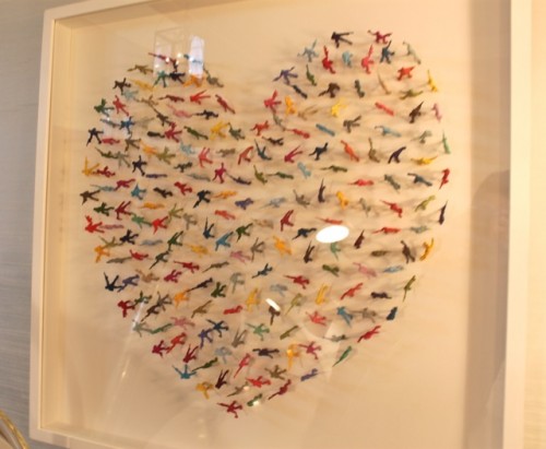 There was fun artwork such as the 3D piece above made of toy soldiers and Stephanie Hirsch‘s “Your Dreams Here” created of oil, rhinestones and embroidery on canvas.