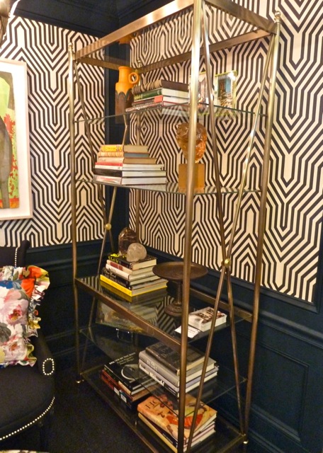 The neoclassical brass & steel étagère is definitely reminiscent of Hadley’s style with its clean geometric lines as a perfect foil for the busy patterns.