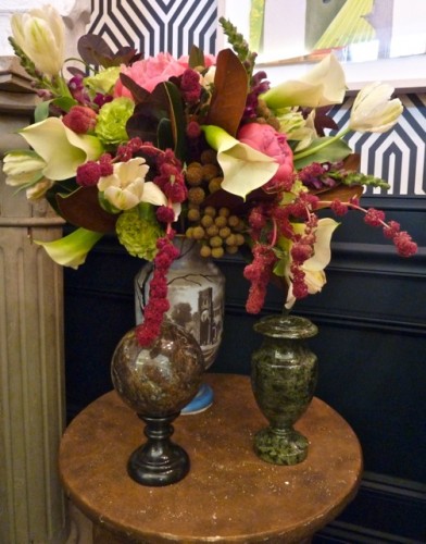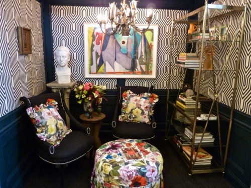 How could anyone not love Christopher Stevens‘ title for his fabulous vignette – Biblioteca Floribunda?! A modern take on a classic English library, his exuberant mix echoed what we have been seeing on the runway and in London – the successful mix of color and pattern, of floral and geometric and of new and old.